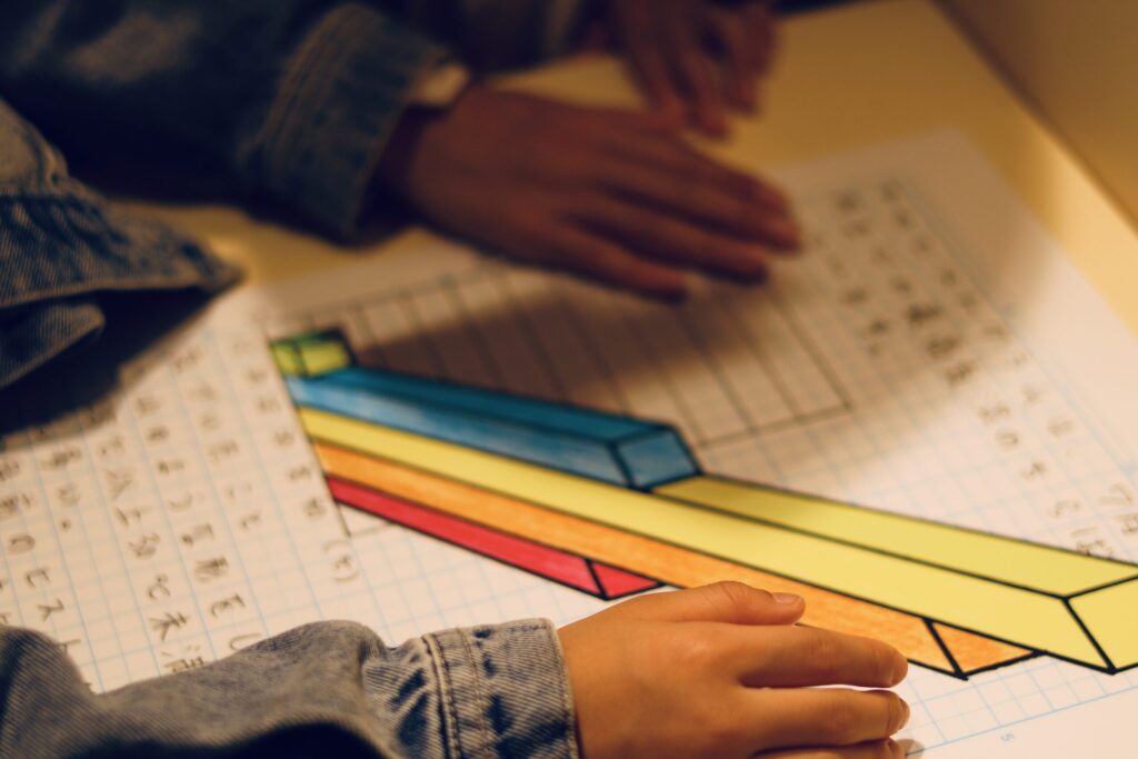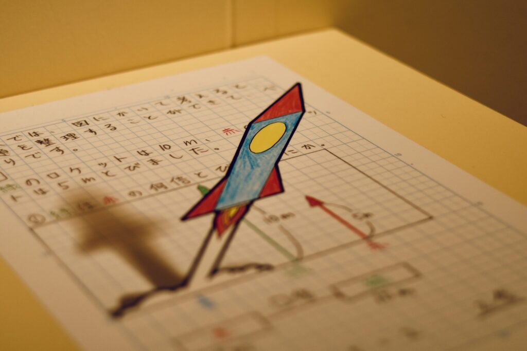 特にノートの罫線や文字と融合させて、ページの上に立体物が浮いているように見せたり、飛び出しているように見せたりと “視覚の錯覚” を巧みに使っているのが特長。