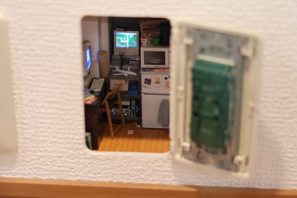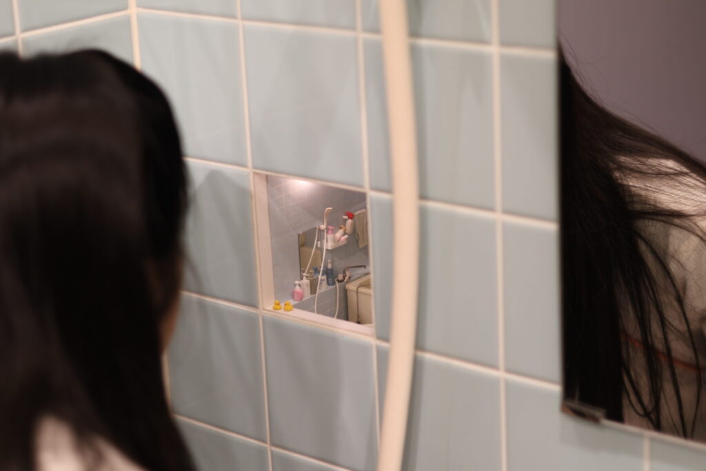 シリーズには、自室・階段・ベランダ・旅館・トイレ・押入れなど、普段何気なく見ている生活空間を、小さな住人が “暮らしている” 風に再構築した作品が多くあります。