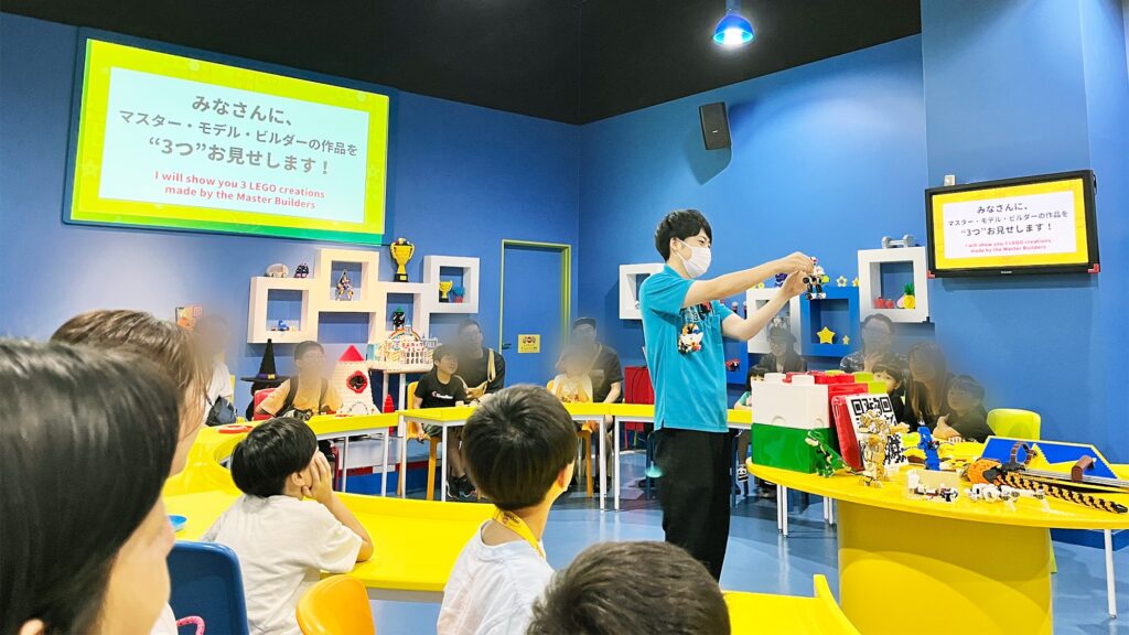 レゴマスターモデルビルダーという、説明書なしに自分でレゴを創作することができるいわゆるレゴのプロが、知識を交ぜながら説明してくれて、みんなで一緒に作品作りをします。