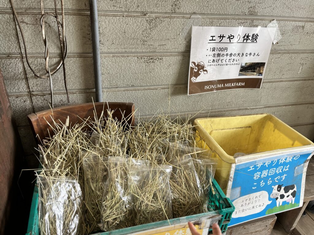 100円でえさやり用の干し草が販売されているので、自由に牛や羊にえさをあげることができます。