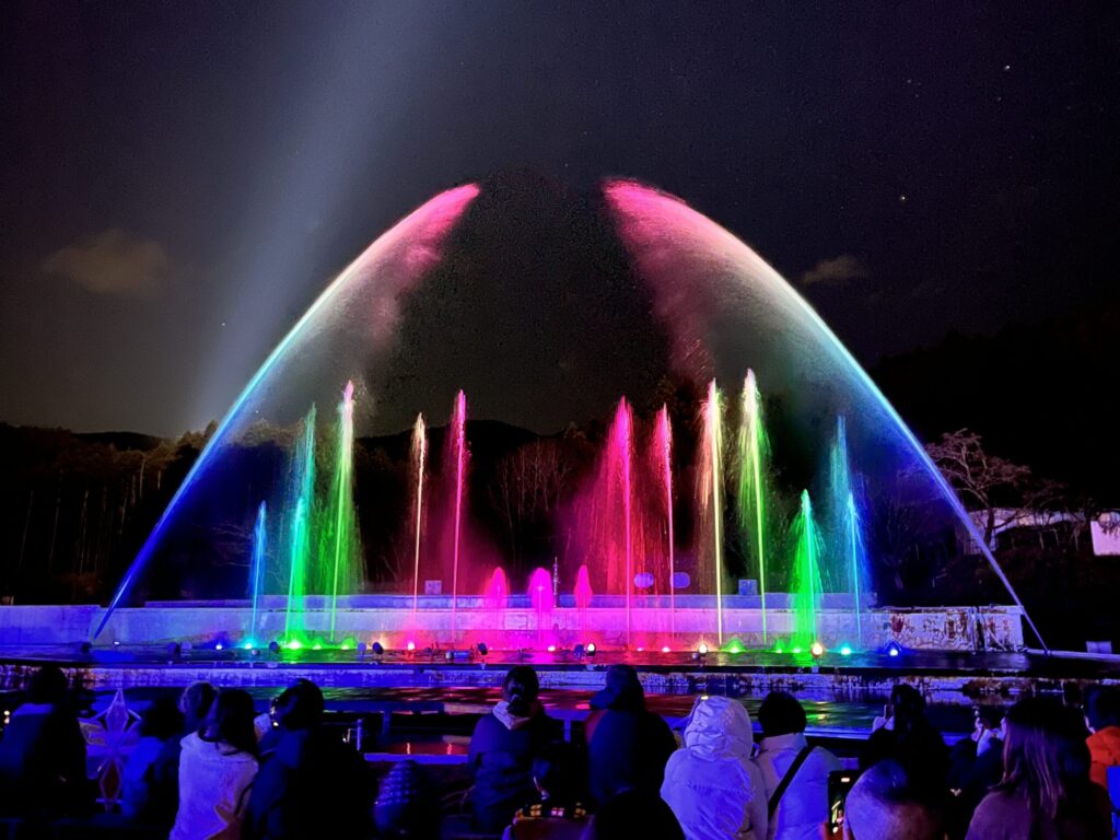 時の栖の名物は、150mもの高さに及ぶ噴水レーザーショー!