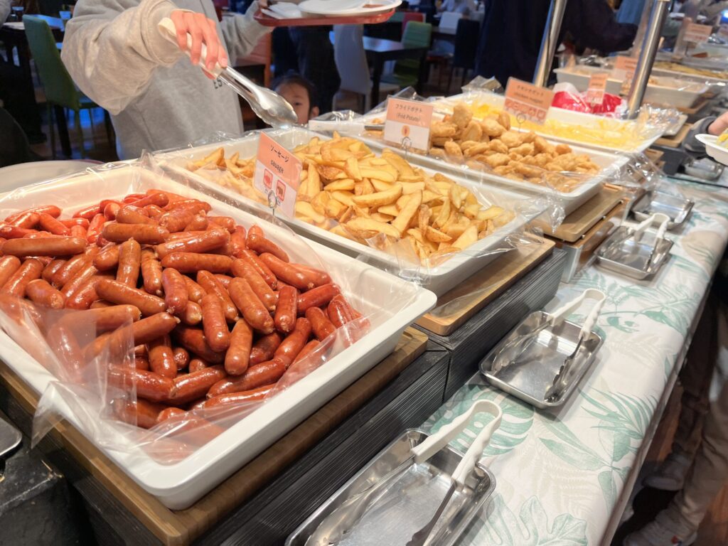 お泊りといえばバイキング!施設内にある麦畑というバイキングはとても広く、お子様メニューも充実しています。