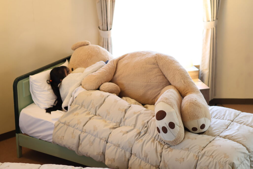 くまさんルームは大きなくまさんがお出迎えしてくれて、終始遊び相手になっていました。